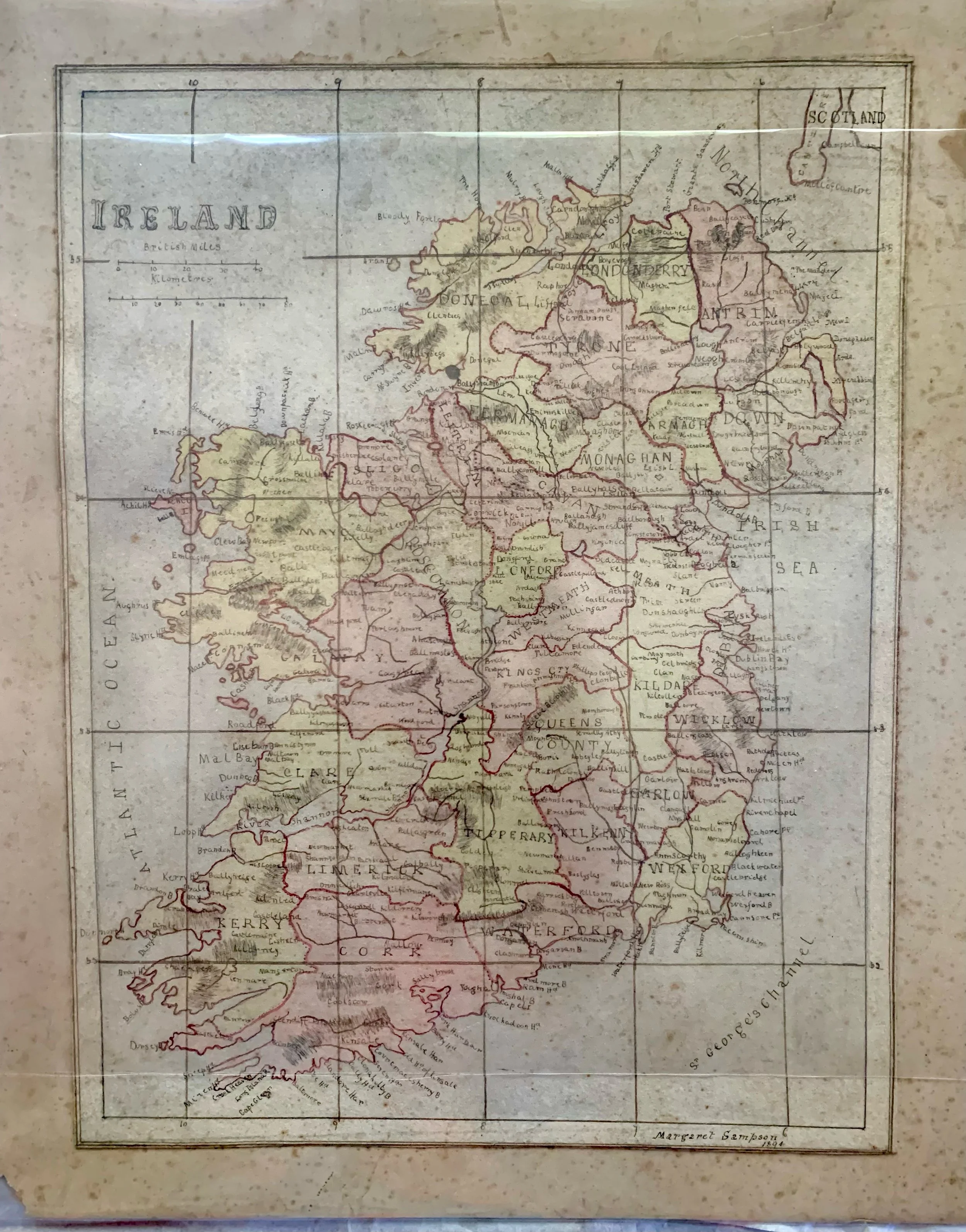 BLUEMANGO BOOKS & MANUSCRIPTS, BOOTH 601. 1894 hand drawn schoolgirl map of Ireland by a Margaret Sampson.