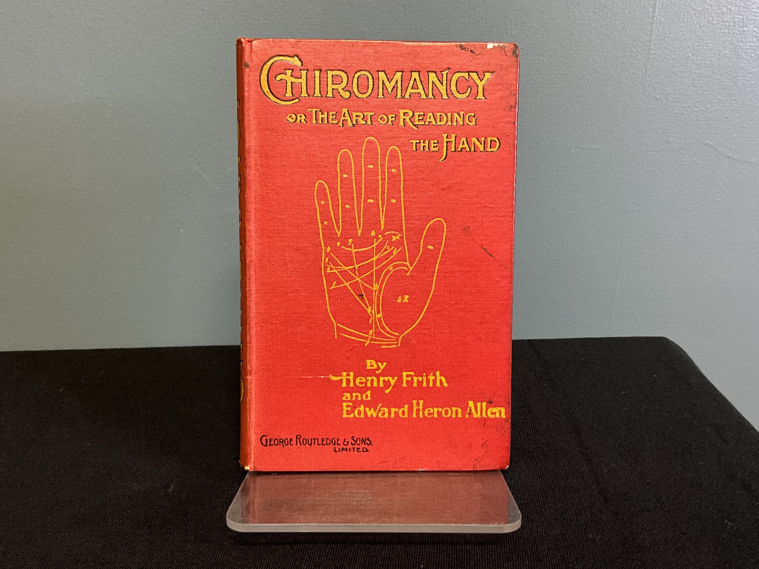 C.S. MILLER BOOKS, BOOTH 702. Frith, Henry, and Edward Heron-Allen. Chiromancy: Or, The Science of Palmistry - Being A Concise Exposition of the Principles and Practice of the Art of Reading the Hand. Illustrated by Dora Noyes. London: George Routledge & Sons, Limited, [circa 1900]. Seventeenth Edition. Vividly decorative red boards, with minor soiling. Black & white illustrations throughout by Dora Noyes. Text block firmly attached. Overall a very good copy. Rare. $100