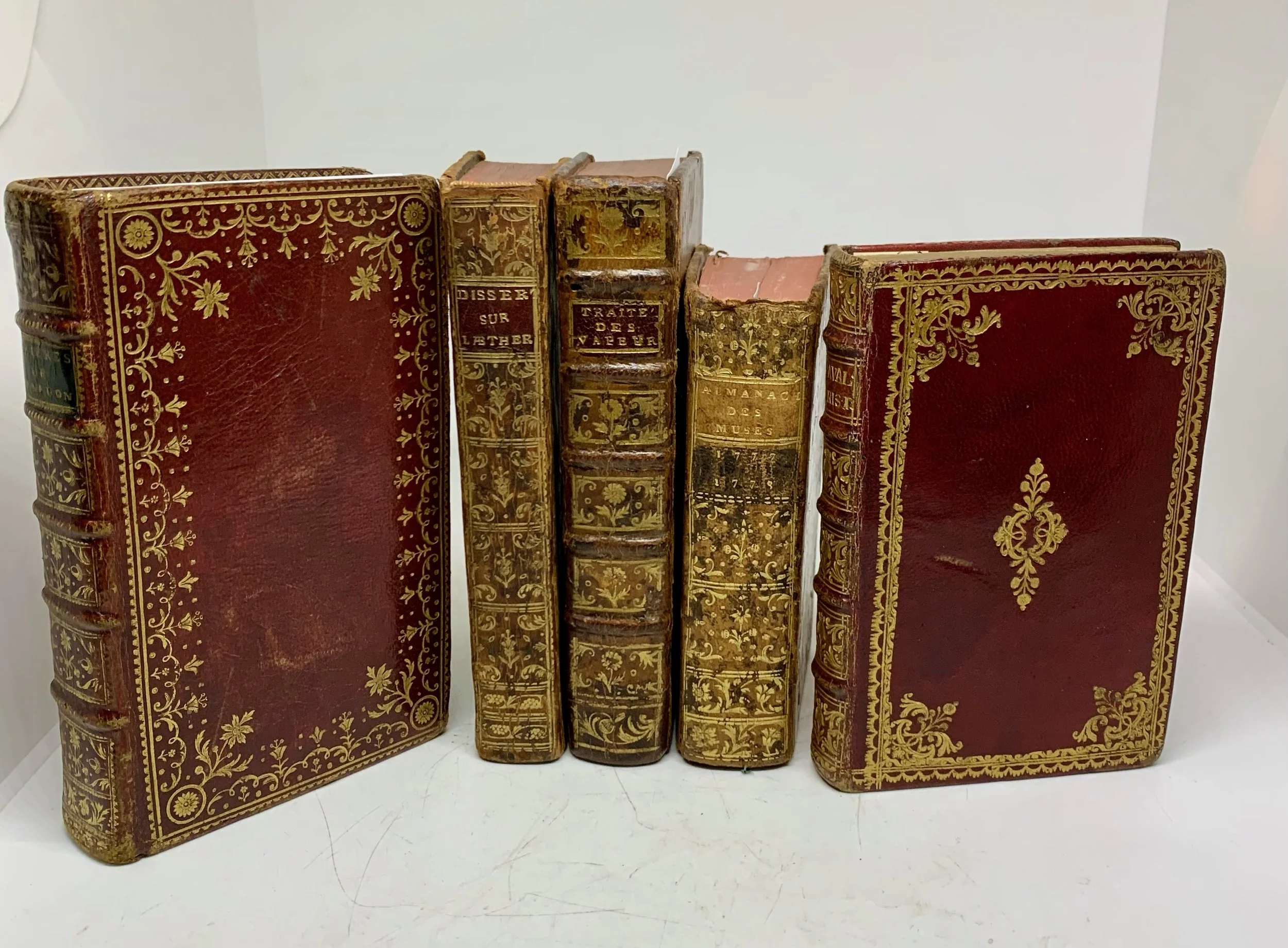 BLUEMANGO BOOKS & MANUSCRIPTS, BOOTH 601. (Left to right): 1768 A French prayer book ($325) 1757 A French medical book, a dissertation on ether ($200) 1767 A French medical work on mental illness ($200) 1777 A French poetry book ($150) 1761 A Portuguese prayer book ($300)