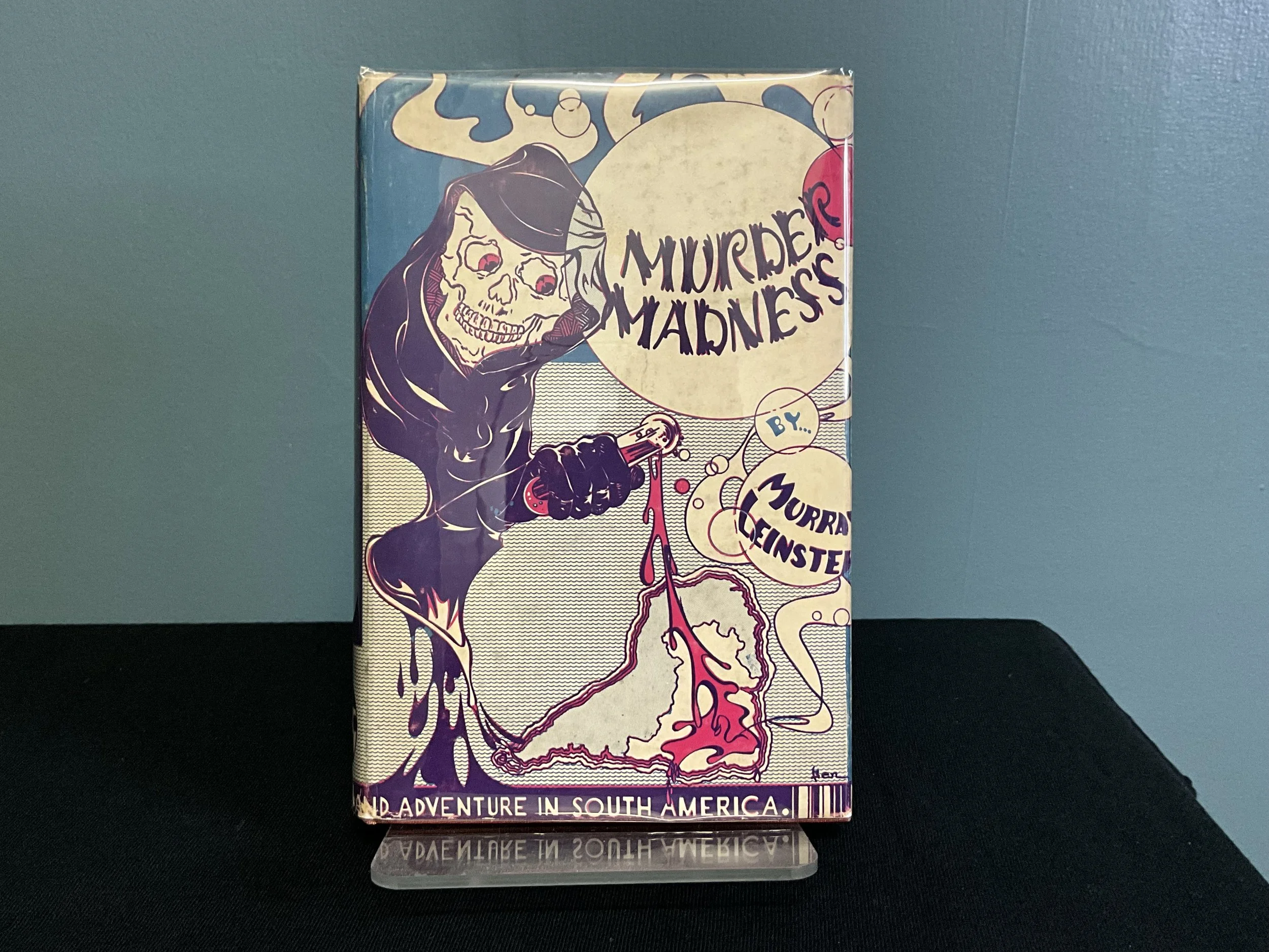 C.S. MILLER BOOKS, BOOTH 702. Leinster, Murray. Murder Madness. Los Angeles: Fantasy Publishing Company, 1949. First edition. 12mo. 298 pp. Red cloth with black lettering. A rare signed fine copy. Former owner's stamp on FFEPG. Pages show typical toning for the period. Near fine, unclipped dust jacket with light rubbing at the bottom spine and back. Spine and corner edges crisp. This novel, first serialized in Astounding magazine in 1930 and published in book form in 1931, tells the story of a tyrant attempting to control civilization with a madness-inducing drug. $500