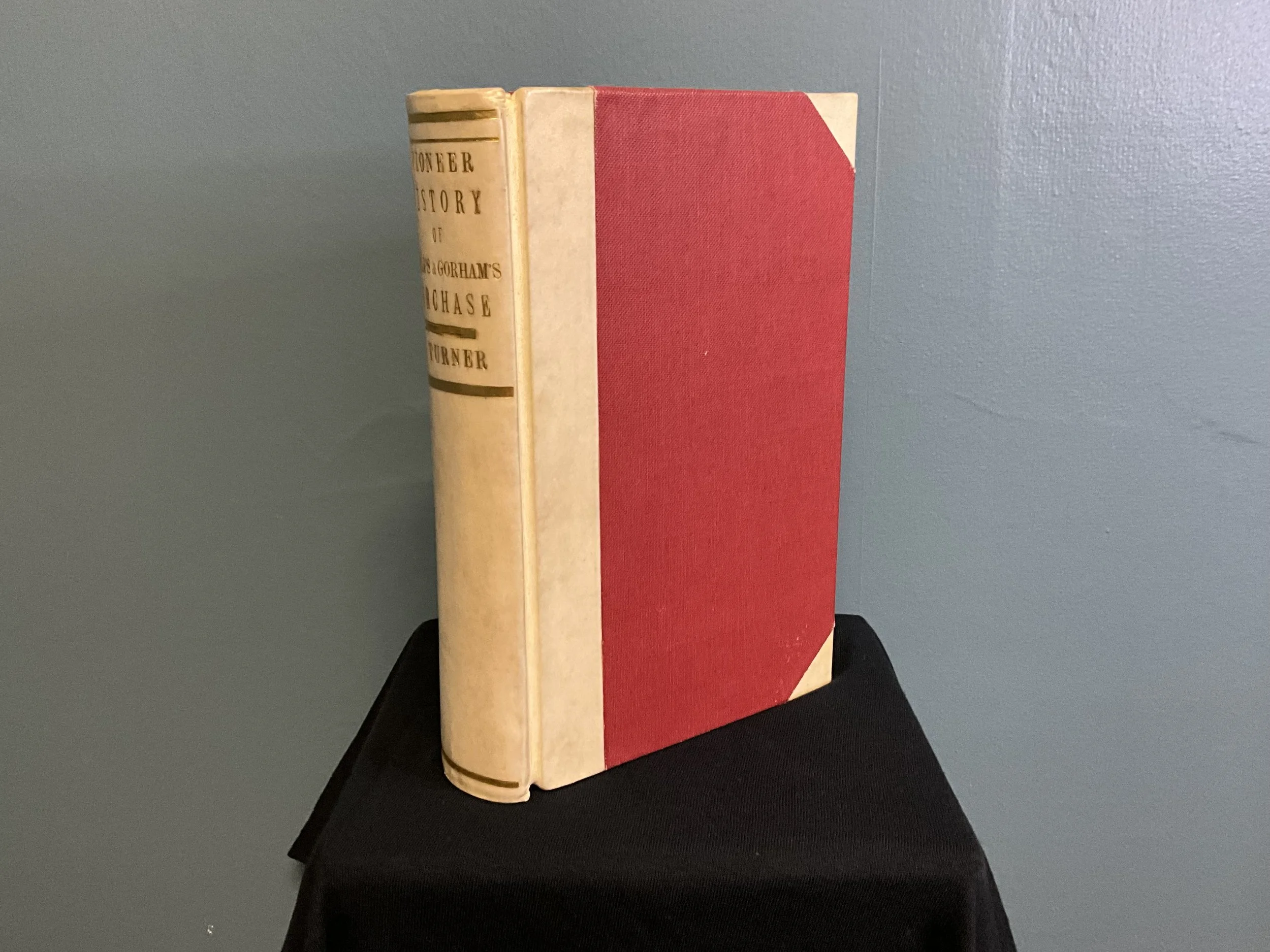 C.S. MILLER BOOKS, BOOTH 702. Turner, Orasmus. History of the Pioneer Settlement of Phelps and Gorham's Purchase, and Morris' Reserve; embracing the Counties of Monroe, Ontario, Livingston, Yates, Steuben, most of Wayne and Allegany and parts of Orleans, Genesee and Wyoming. To which is added, a Supplement, or Extension of the Pioneer History of Monroe County. Rochester [New York]: Published by William Alling. Stereotyped by J. W. Brown, Rochester. Printed by Lee, Mann & Co., Rochester, N.Y, 1851. 8vo, 624 pp. Fine clean text block, rebound in half vellum with scarlet cloth covers and endpapers. Gold lettering and decoration on the spine, accented by gilt edges. $425